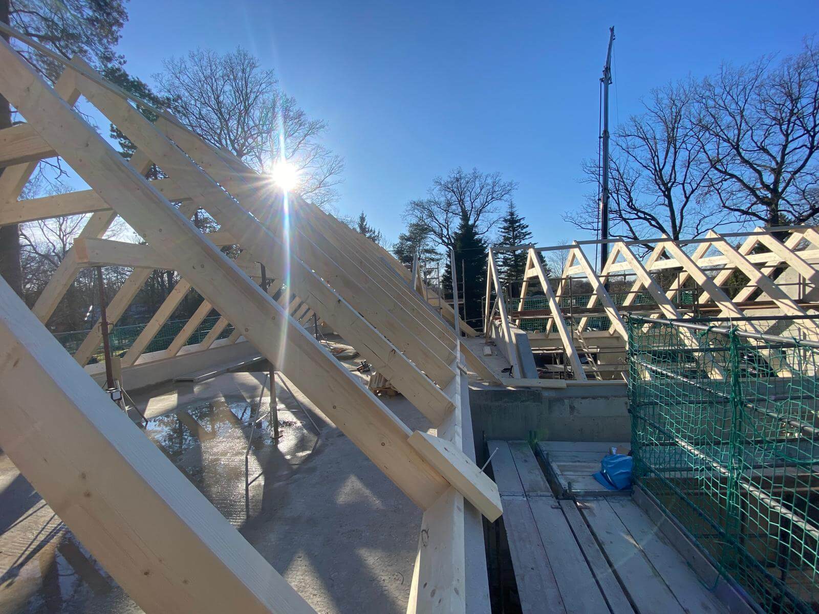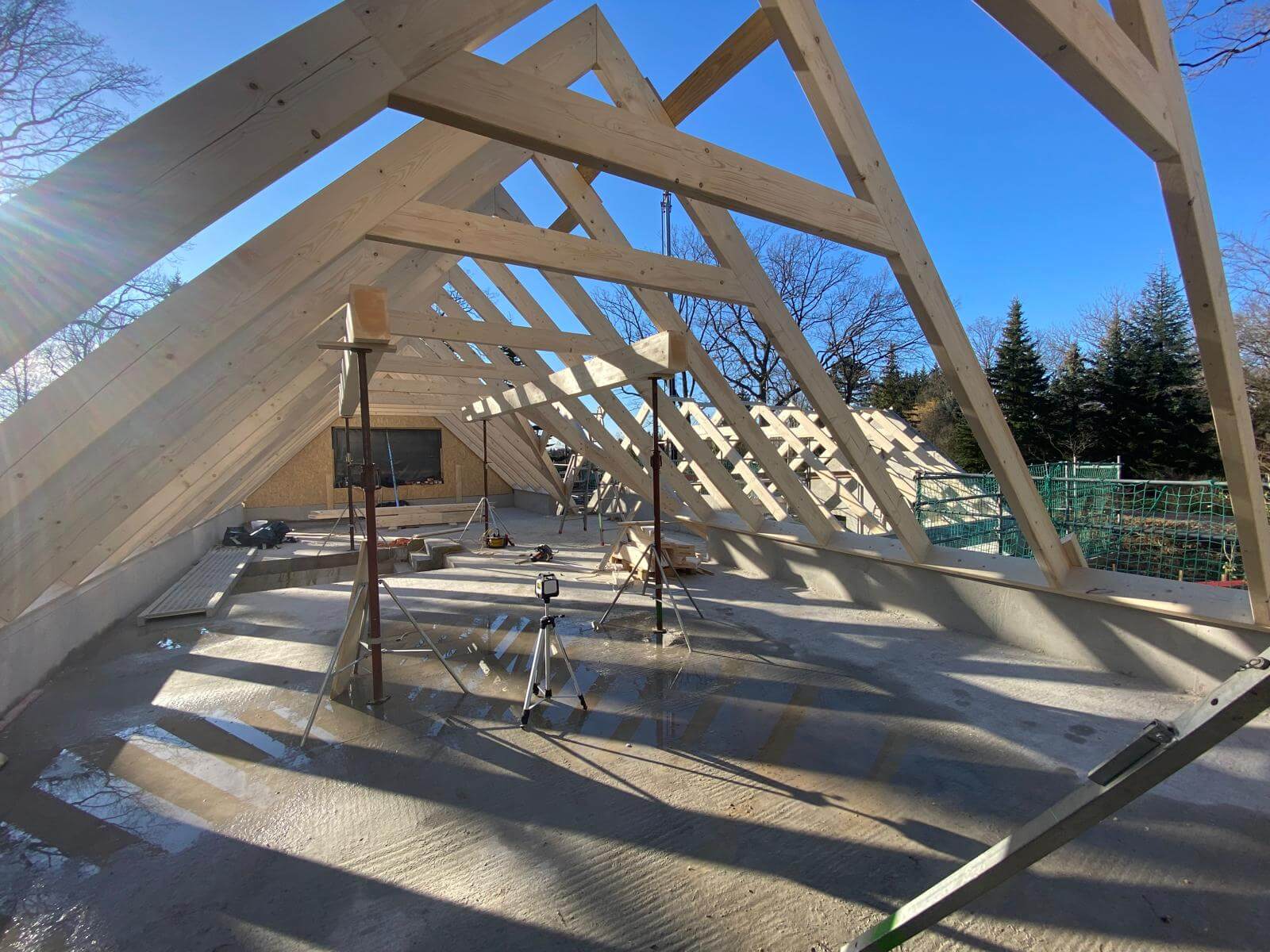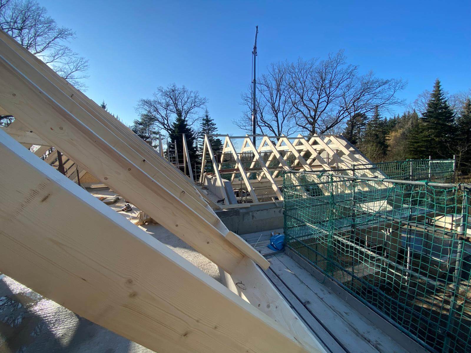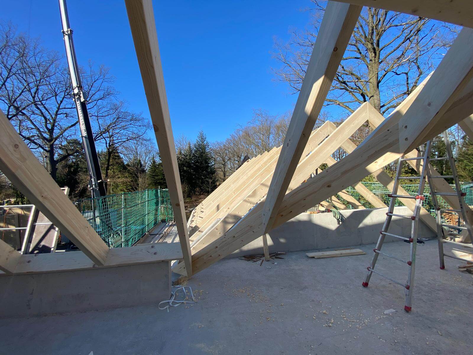 Hier wurde ein Satteldach mit Pfetten und Kehlbalken als Sichtdachstuhl auf einem Einfamilienhaus mit Garage errichtet. Besonderheit alle Verbindungen wurden Verdeckt ausgeführt.